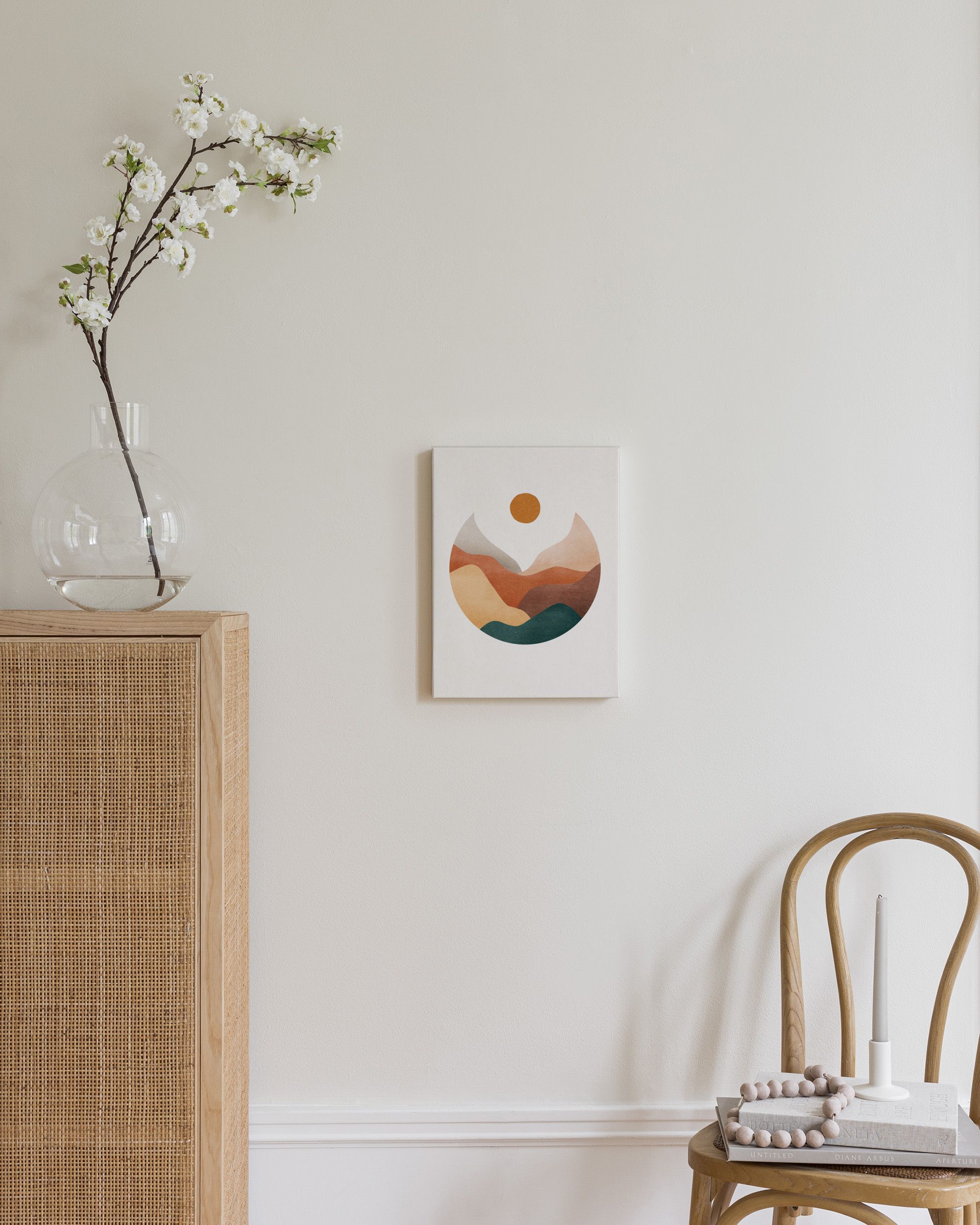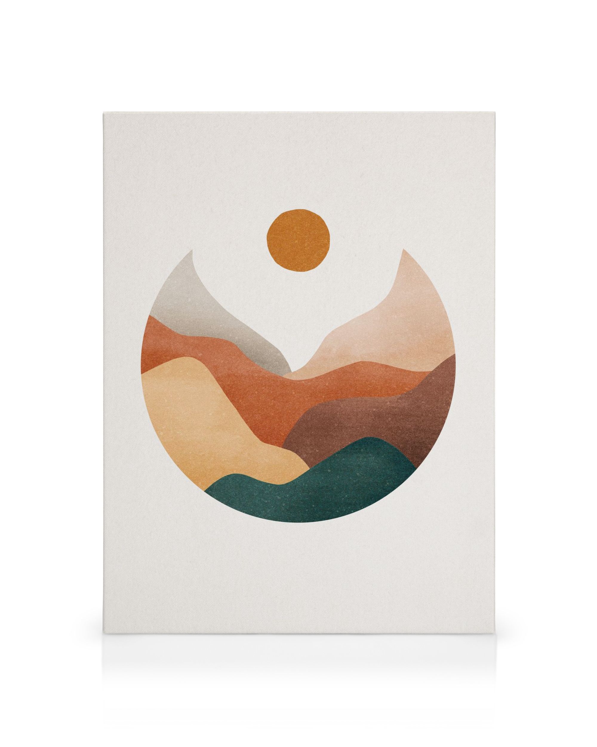 Fra 64,80 krEt vakkert lerretsbilde som viser åser i oransje, brunt og grønt inni en sirkel. En liten oransje sol skinner over sirkelen mot en hvit bakgrunn.