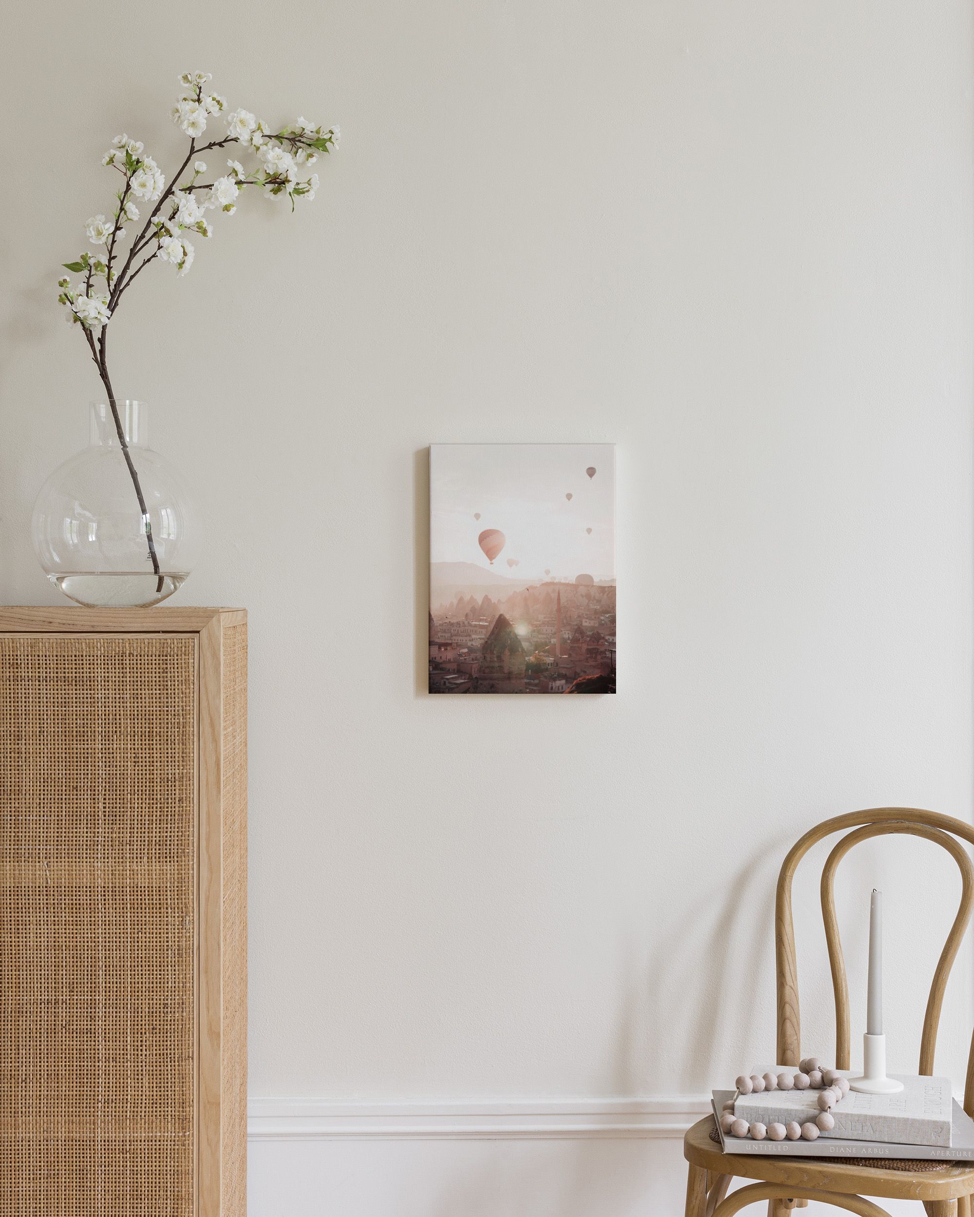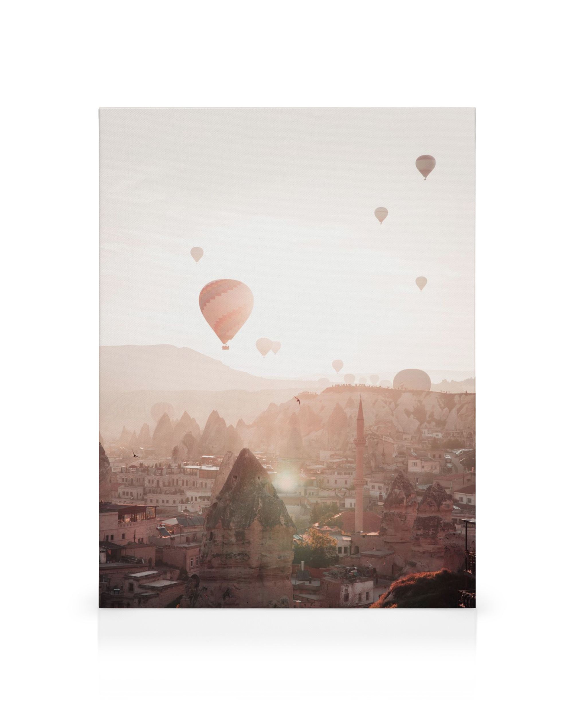 En vakker plakat som viser luftballonger over det berømte landskapet i Cappadocia. Plakaten fanger ballongene som flyter i himmelen over spisse steinformasjoner i rosa og beige nyanser.
