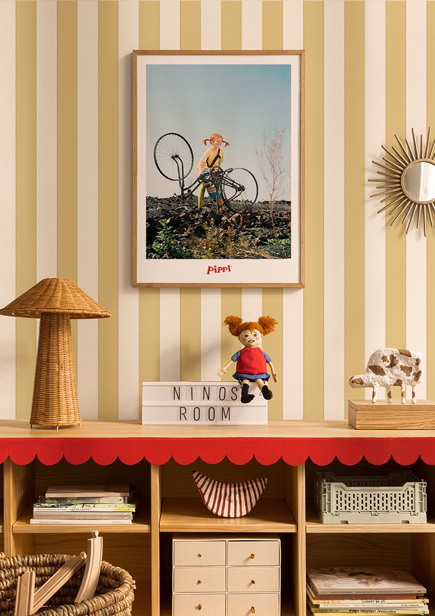 En fargerik plakat som viser Pippi Langstrømpe med sine røde fletter på sykkel. Ordet "Pippi" vises nederst mot en lyseblå himmel.