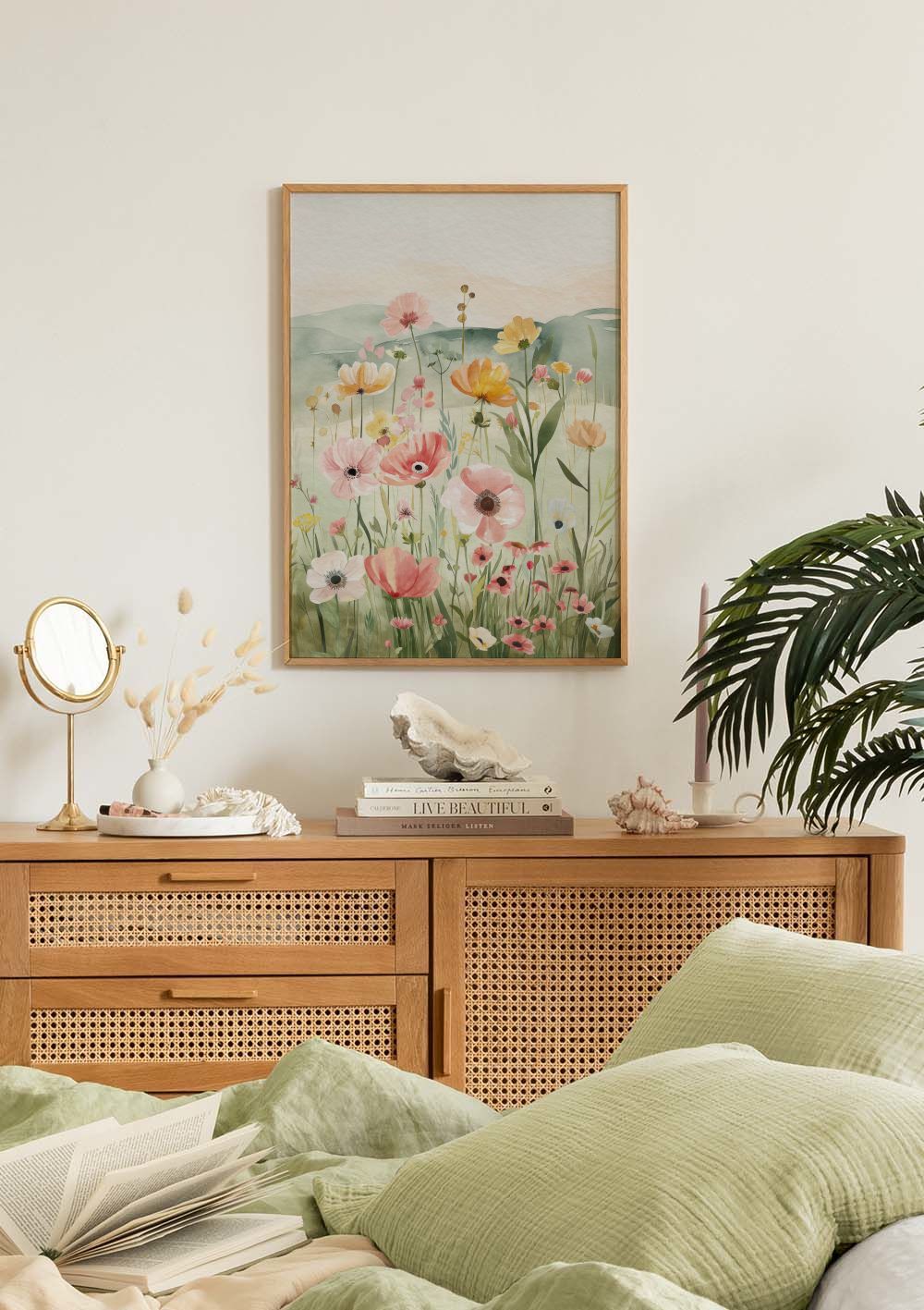Fra 97,50 krEn vakker plakat med akvarellmalte blomster i en eng. Plakaten viser blomster i nyanser av rosa, rød, gul og oransje mot en myk grønn bakgrunn.