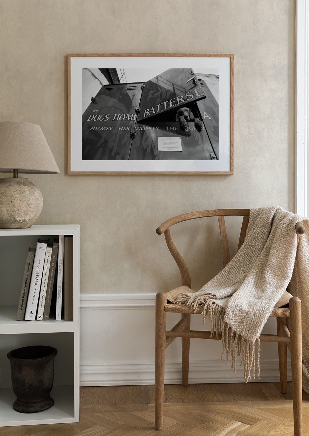 En søt plakat med et bilde av en hund som stikker hodet ut av en luke. Plakaten er i sort-hvitt og skaper en rolig og fin følelse.