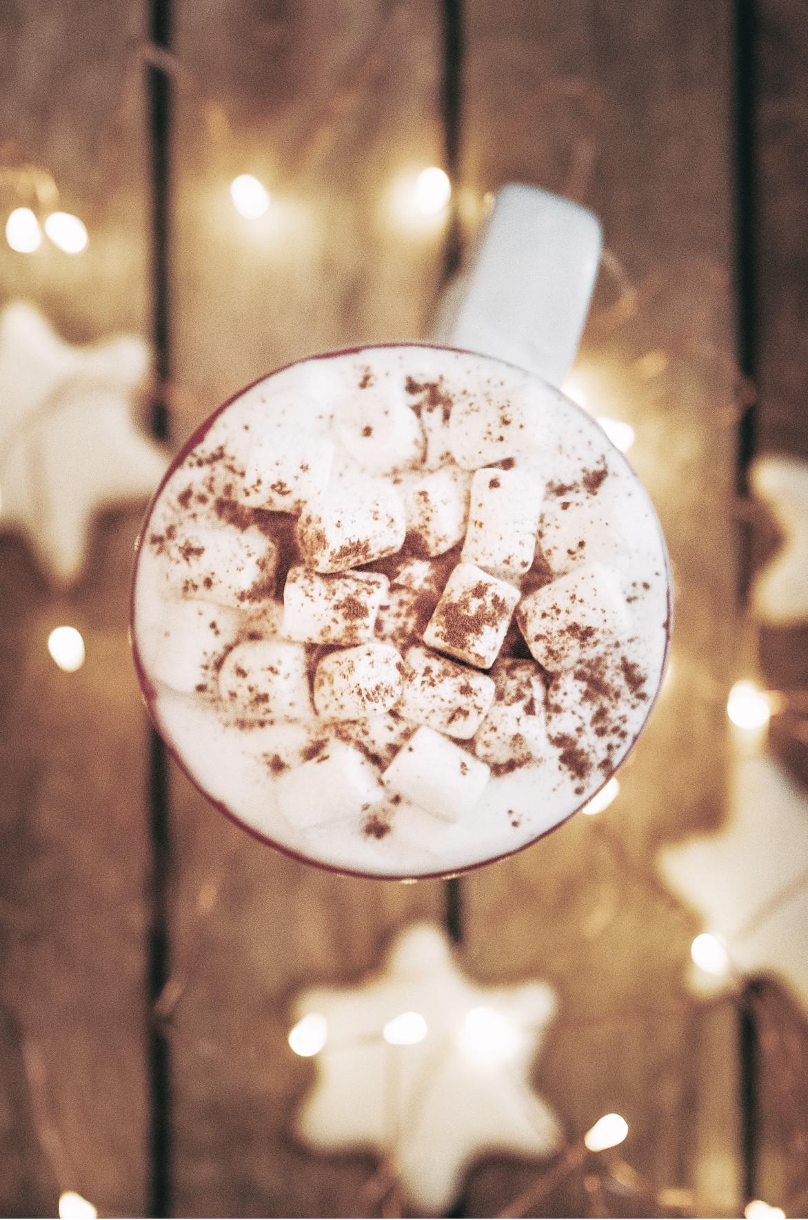 Foto av en varm sjokoladekopp med krem og kanel på et brunt bord med lyse snorer. Legg til dette trykket på kjøkkenet og skap en julestemning. Dette kunsttrykket har en kornete fotostruktur.