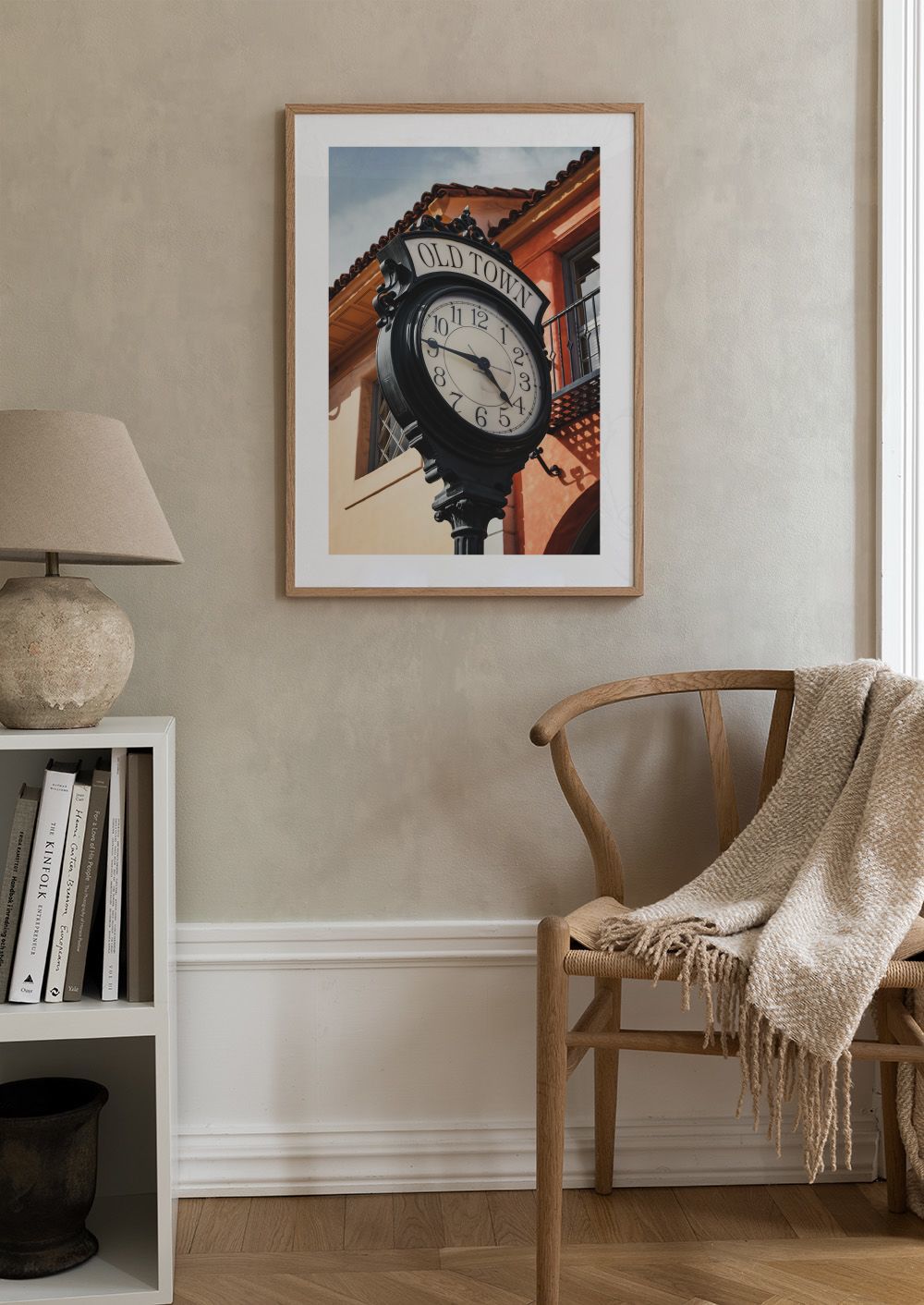 En vakker plakat som viser en stor, svart klokke i vintagestil. Plakaten har teksten 'OLD TOWN' øverst på klokken, med fargerike bygninger i bakgrunnen.