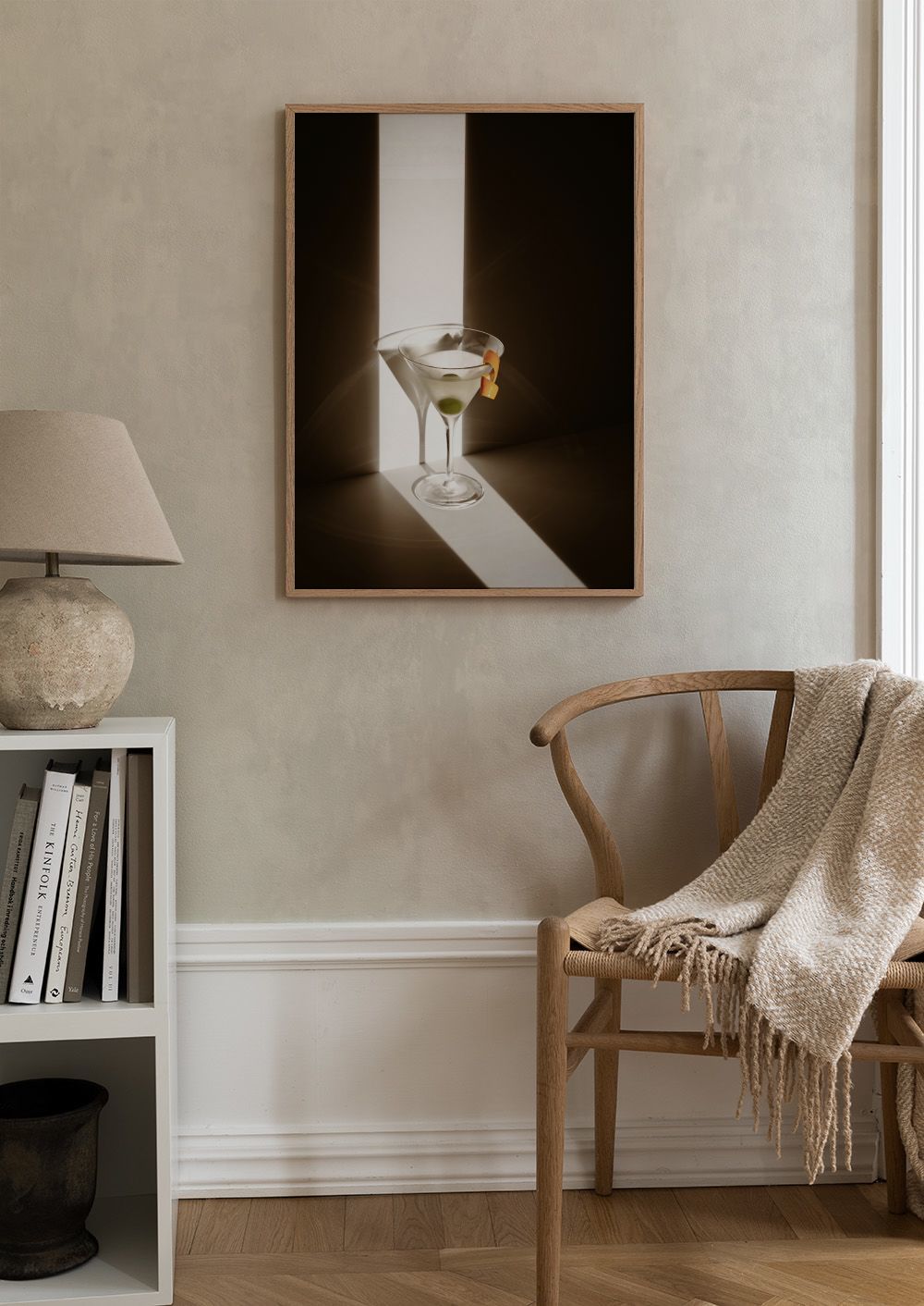 En stilren plakat som viser et klassisk martiniglass med en grønn oliven og en appelsinskall. Plakaten har sterkt lys som skaper fine skygger og refleksjoner.