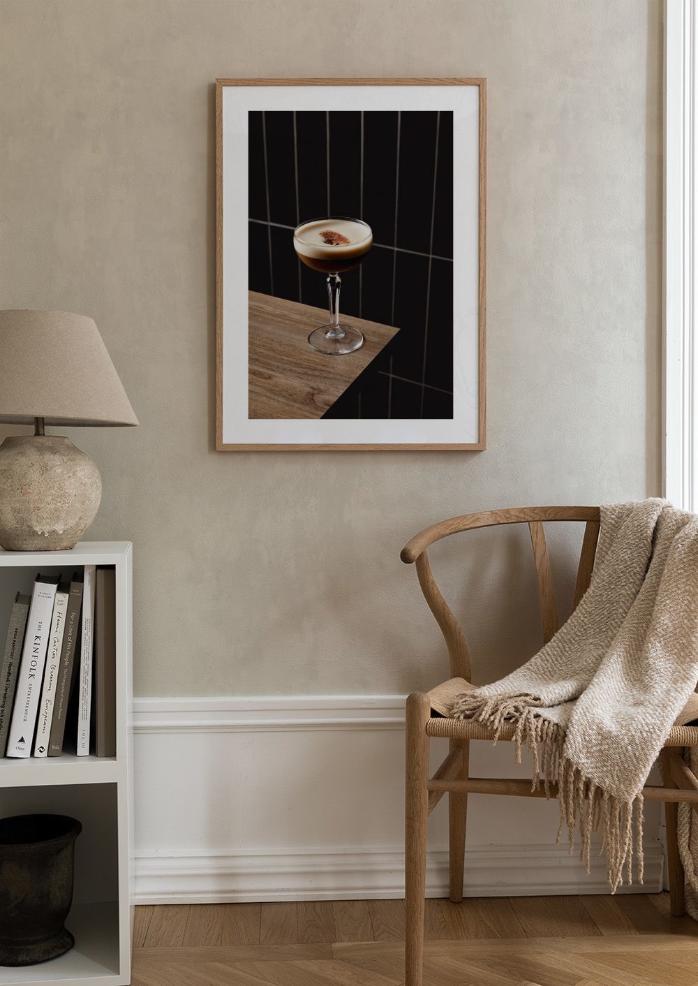 En stilig plakat av en espresso martini i et cocktailglass. Plakaten viser en mørk drink med kremtopp og kakao, perfekt for kjøkkenet eller stuen.
