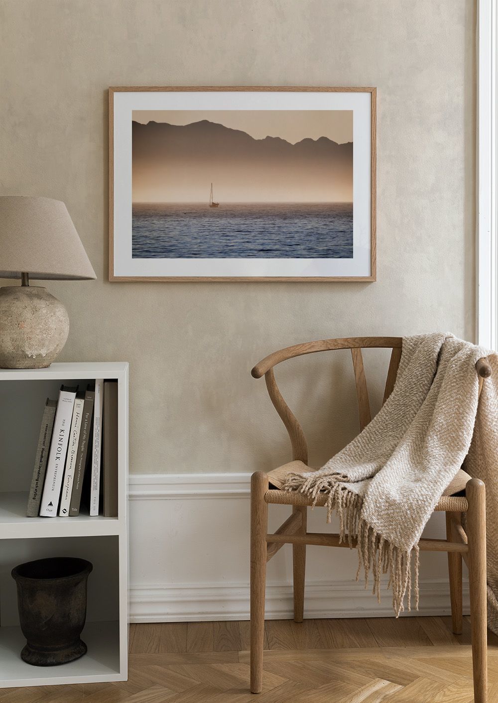 En vakker plakat som viser en liten seilbåt på rolig, blått vann. I horisonten skinner en tåkete, oransje glød, mens mørke fjell står i bakgrunnen. Plakaten skaper en fredelig stemning.