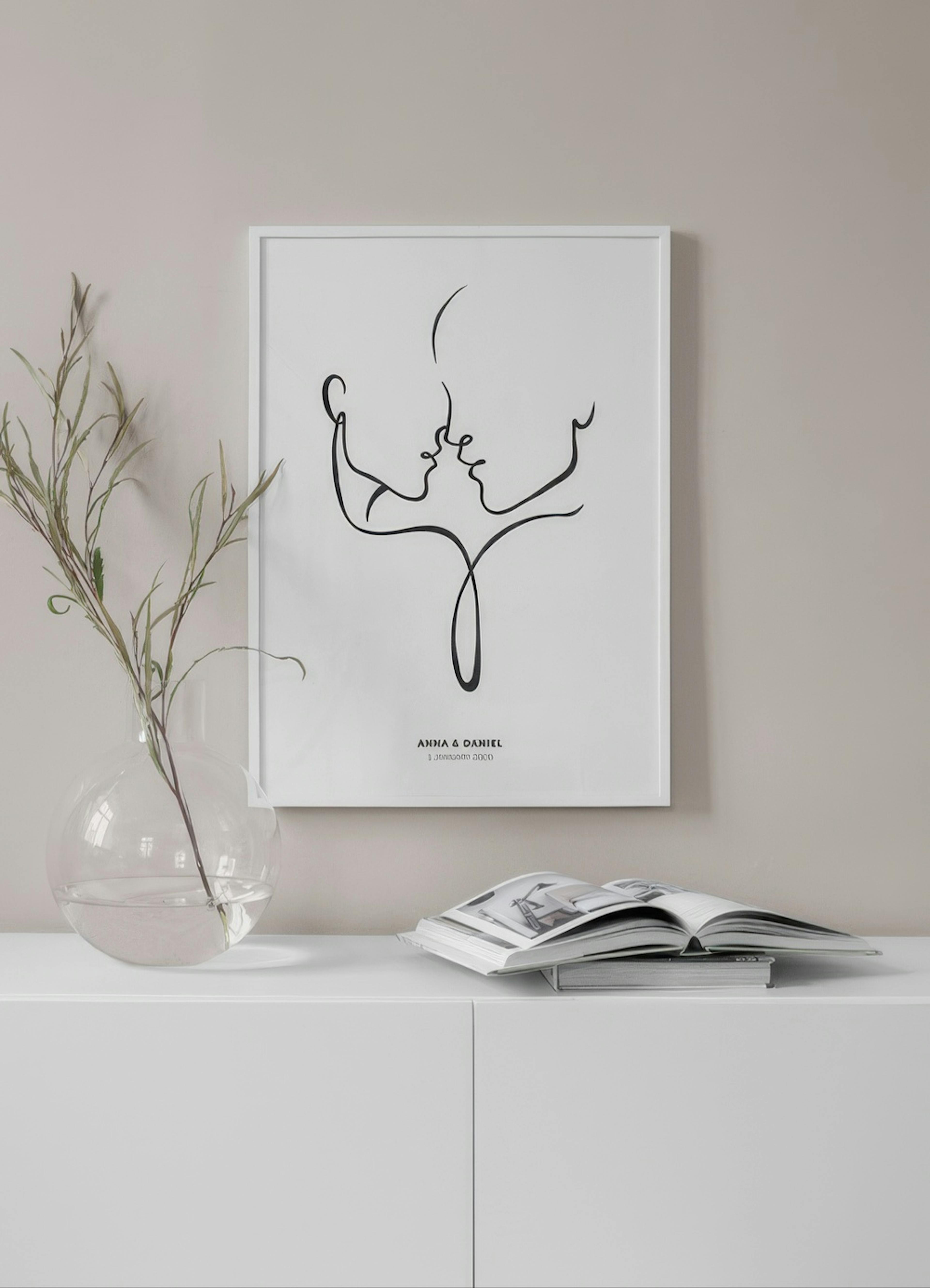 Fra 64,80 krPersonlig plakat med en line art-skisse av to ansikt som nesten kysser, med navn, dato og sted under. Med denne minimalistiske plakaten kan du lage en personlig plakat til deg og den du elsker. Skriv inn navnene deres, en spesiell dato og et sted som betyr ekstra mye for dere to!