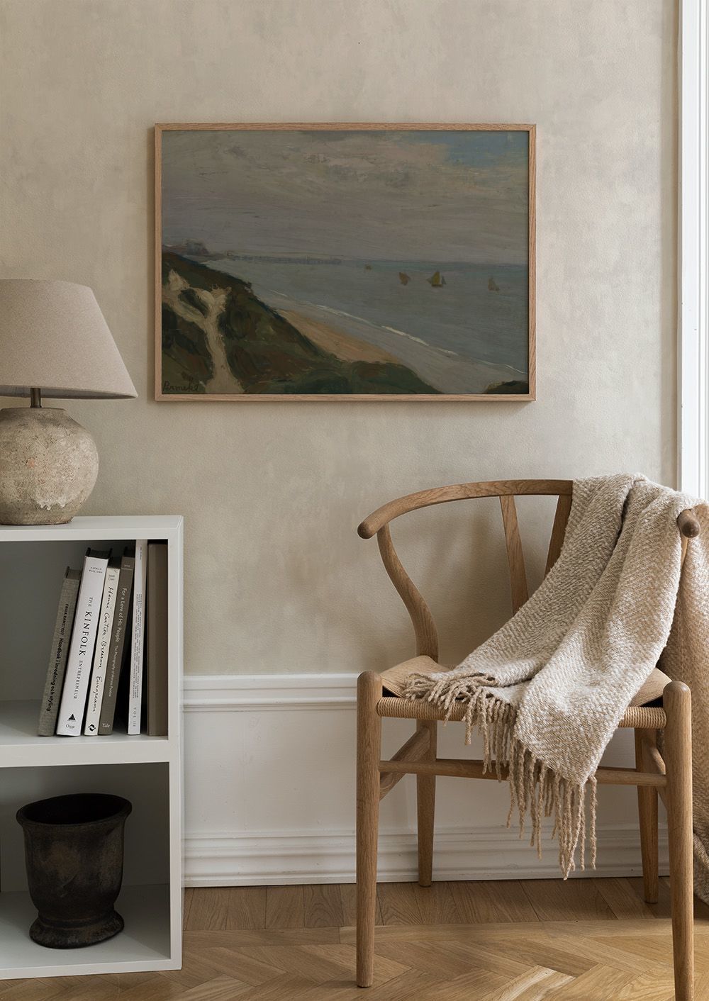 En vakker plakat som viser en rolig kystscene med seilbåter på havet. Plakaten har myke farger og synlige penselstrøk som gir en fredelig følelse.