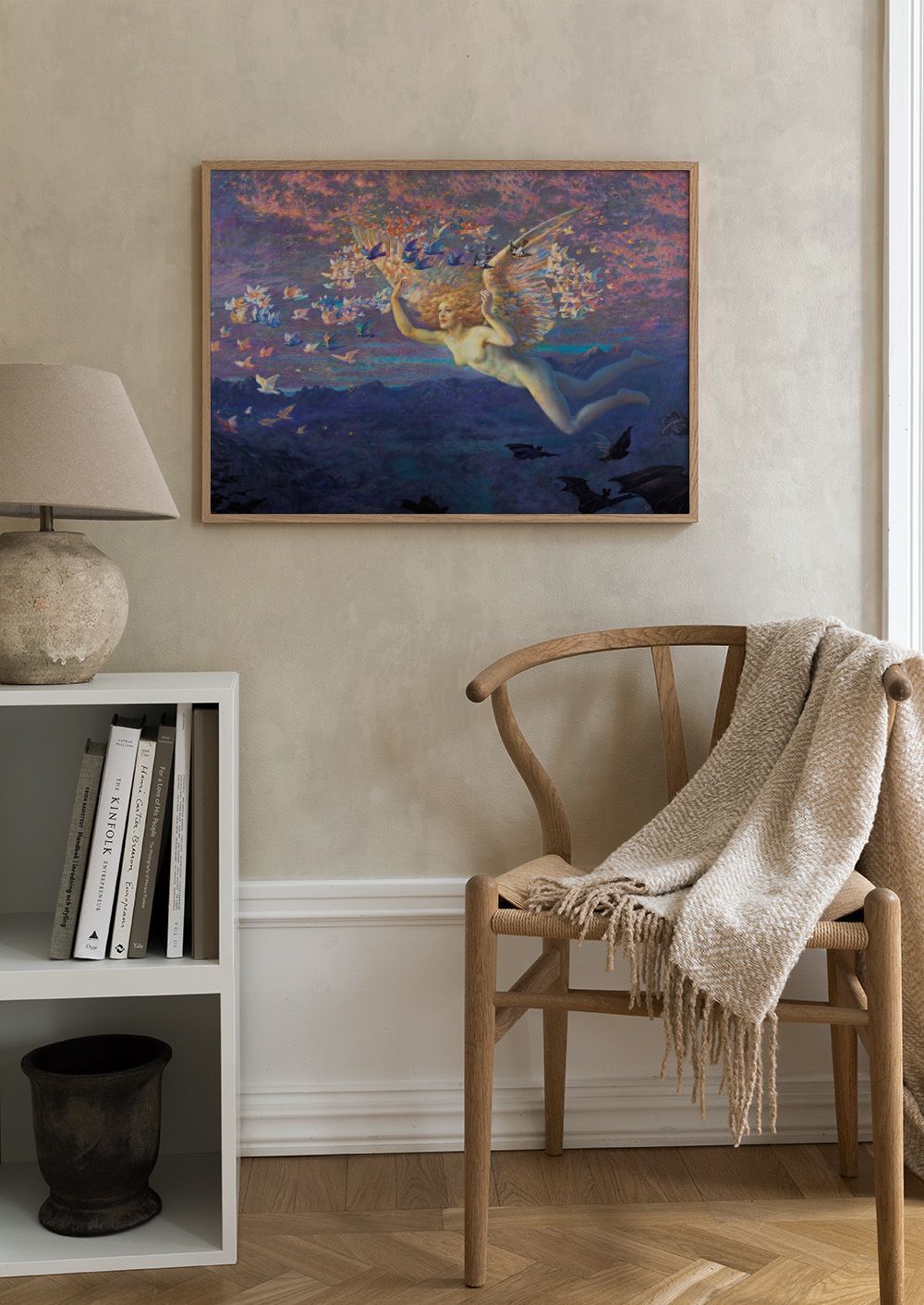 Fra 75,60 krEn vakker plakat som viser en vinget figur med gyllent hår som flyr i en fargerik himmel. Plakaten har store vinger i gull og brunt, omgitt av små fugler i rosa, blått og oransje.