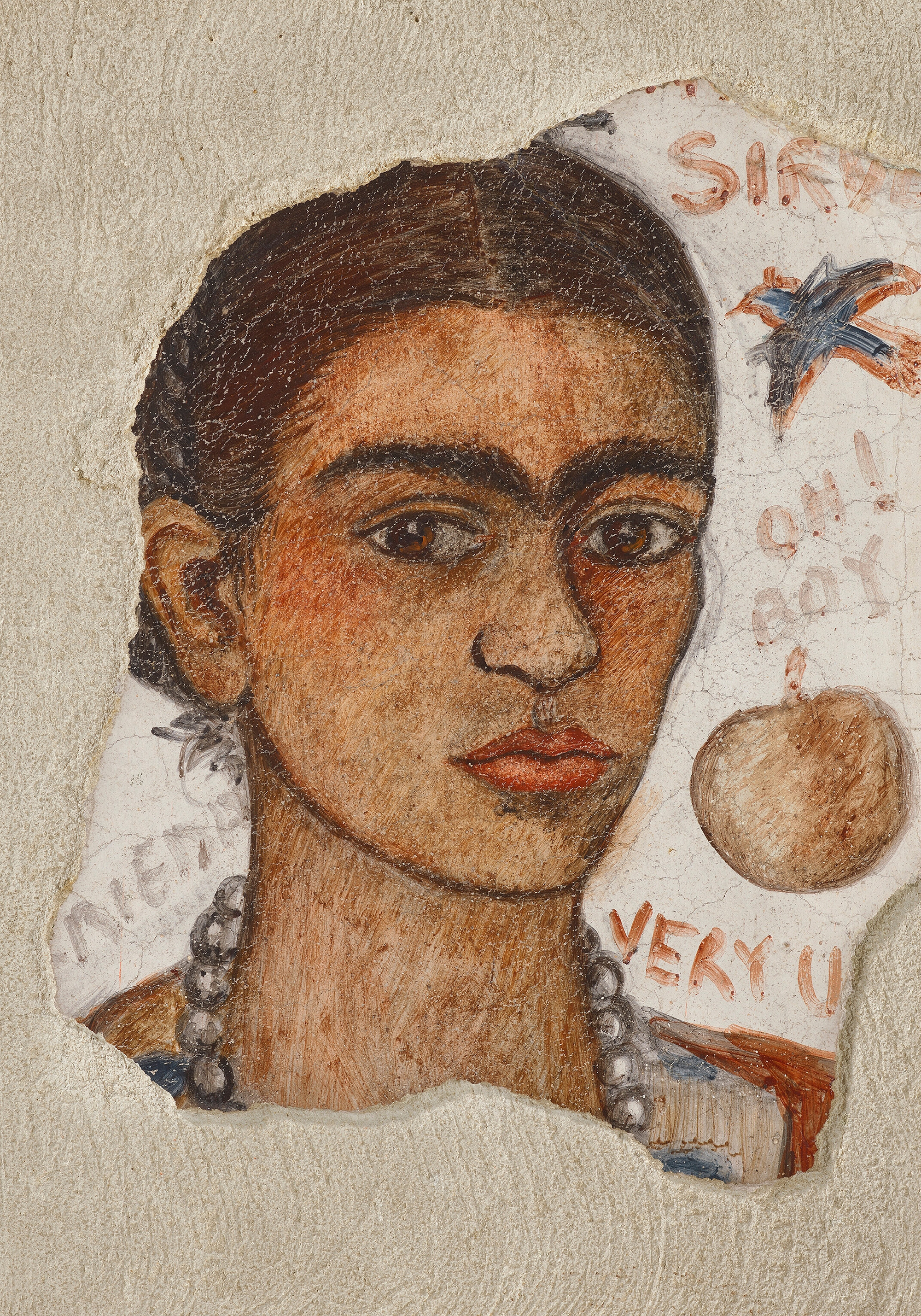 En plakat som viser et portrett med mørkt hår og tydelige øyebryn. Plakaten har jordfarger som rødt og brunt, med ord og symboler i bakgrunnen.