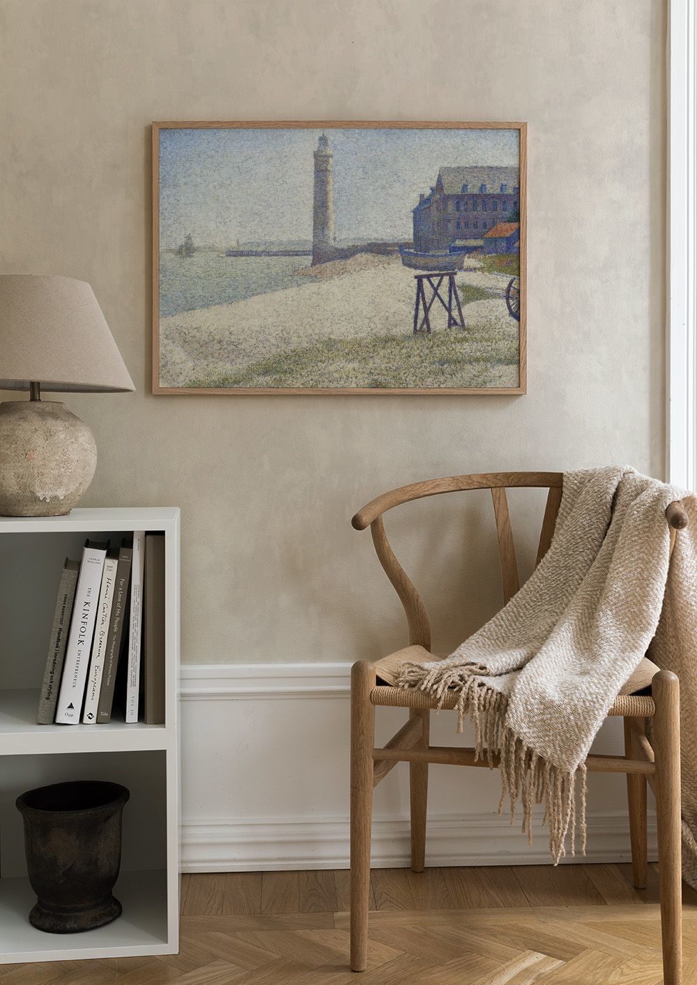 En vakker plakat som viser et fyrtårn ved havet. Plakaten er malt med små prikker i farger som blått, grønt og beige, og gir et unikt uttrykk.