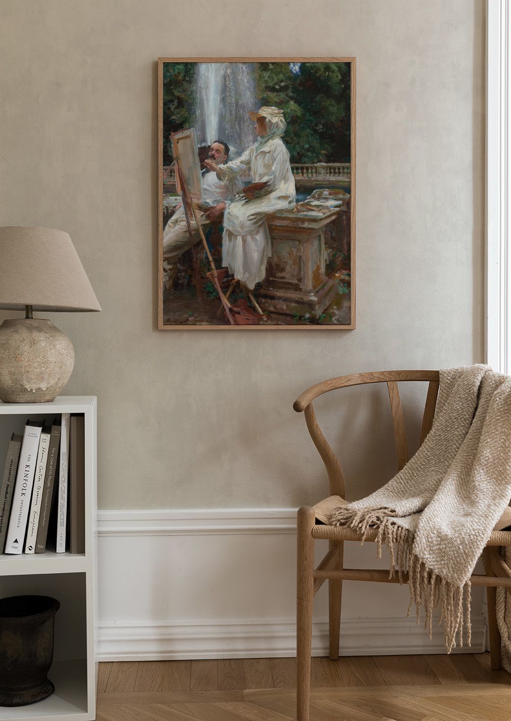 Fra 75,60 krEn vakker plakat som viser en kunstner som maler ved en fontene. Plakaten fanger en fredelig scene med en kvinne i hvit kjole som sitter og maler, mens en mann hviler ved siden av henne. I bakgrunnen renner vann ned fra en stor fontene, omgitt av grønne trær.