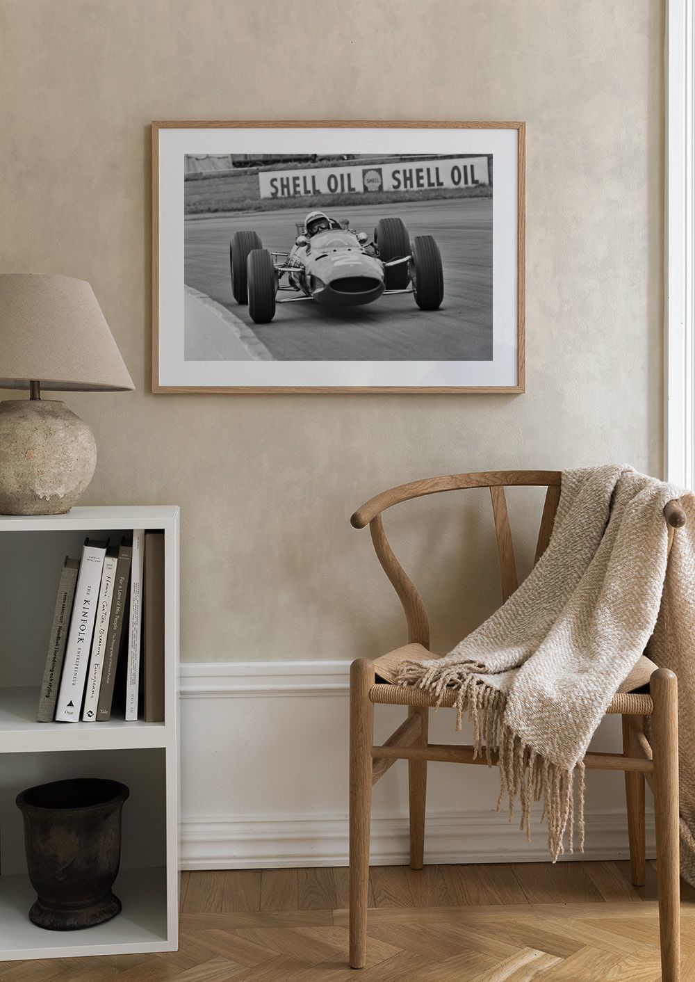 En plakat av en gammel racerbil på banen. Plakaten viser en racerbil med store hjul og en fører med hjelm og briller. Bildet er i svart-hvitt.