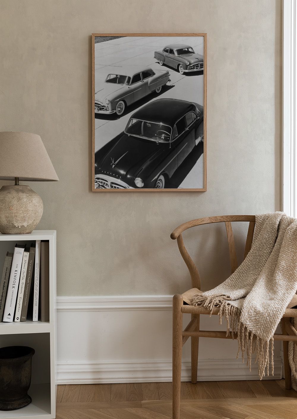 Fra 64,45 krEn stilig plakat med tre gamle biler fra 1900-tallet. Plakaten viser klassiske biler med runde lykter og blanke krom-detaljer i sort-hvitt.