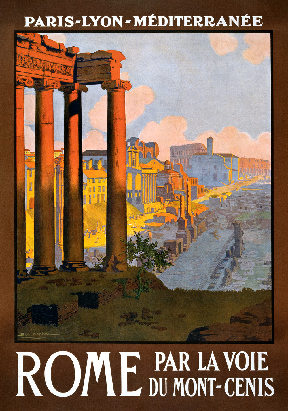Fra 64,45 krEn vakker plakat som viser gamle orange søyler og bygninger i gule og blå toner. Plakaten har en lys blå himmel med rosa skyer og grønne planter.